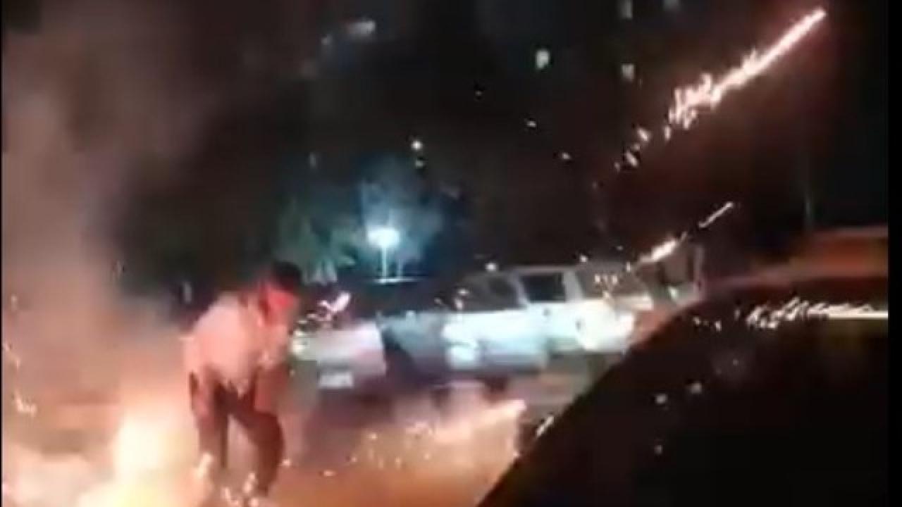 Havai fişeklerden 5’i gökyüzünde patlarken, 1’i elde patladı. Patlamanın ardından kişi, düzeneği yere atınca fişekler ateşlenmeye devam etti.